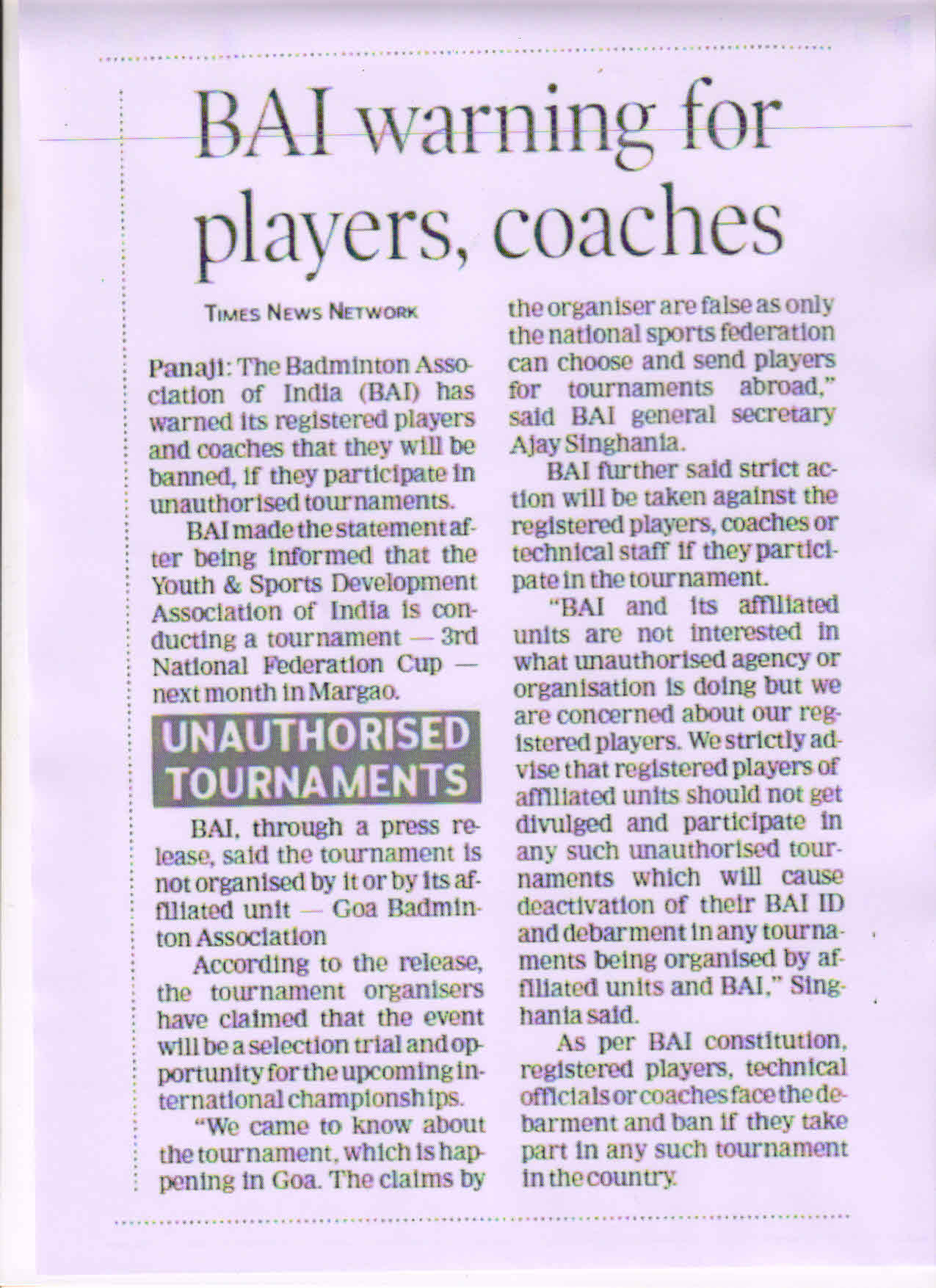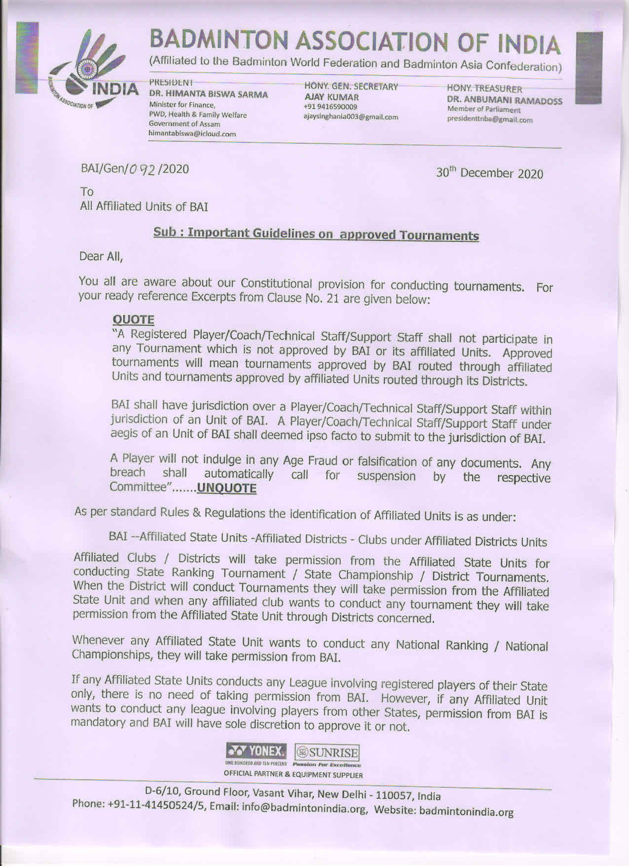 IMPORTANT - BAI CIRCULAR DATED 30TH DECEMBER, 2020 GIVING GUIDELINES FOR APPROVING TOURNAMENTS & PARTICIPATION NORMS ALSO FOR REGISTERED PLAYERS/COACHES/SUPPORT STAFF/TECHNICAL STAFF